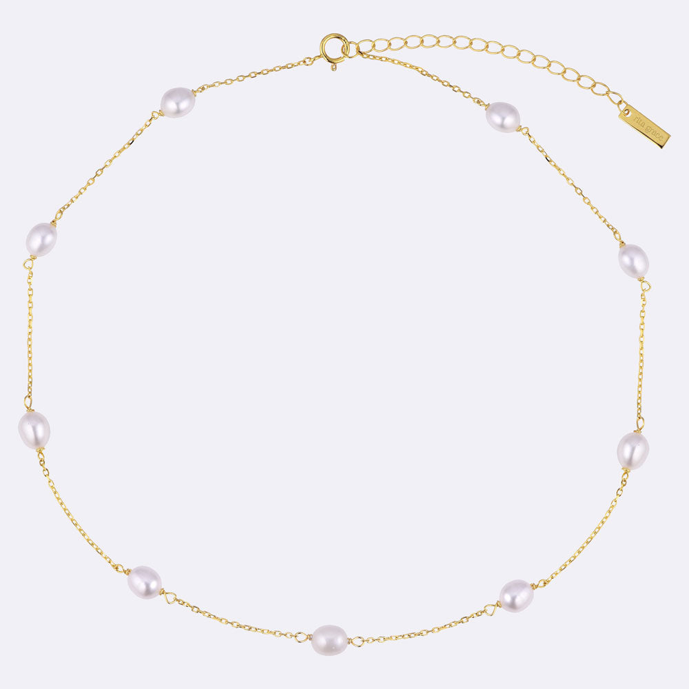 A timeless classic, perfect for brides, bridesmaids, and special occasions. Features nine lustrous freshwater pearls (approx 6–7mm each) on a delicate chain. Adjustable from 14" to 16" for the perfect fit.